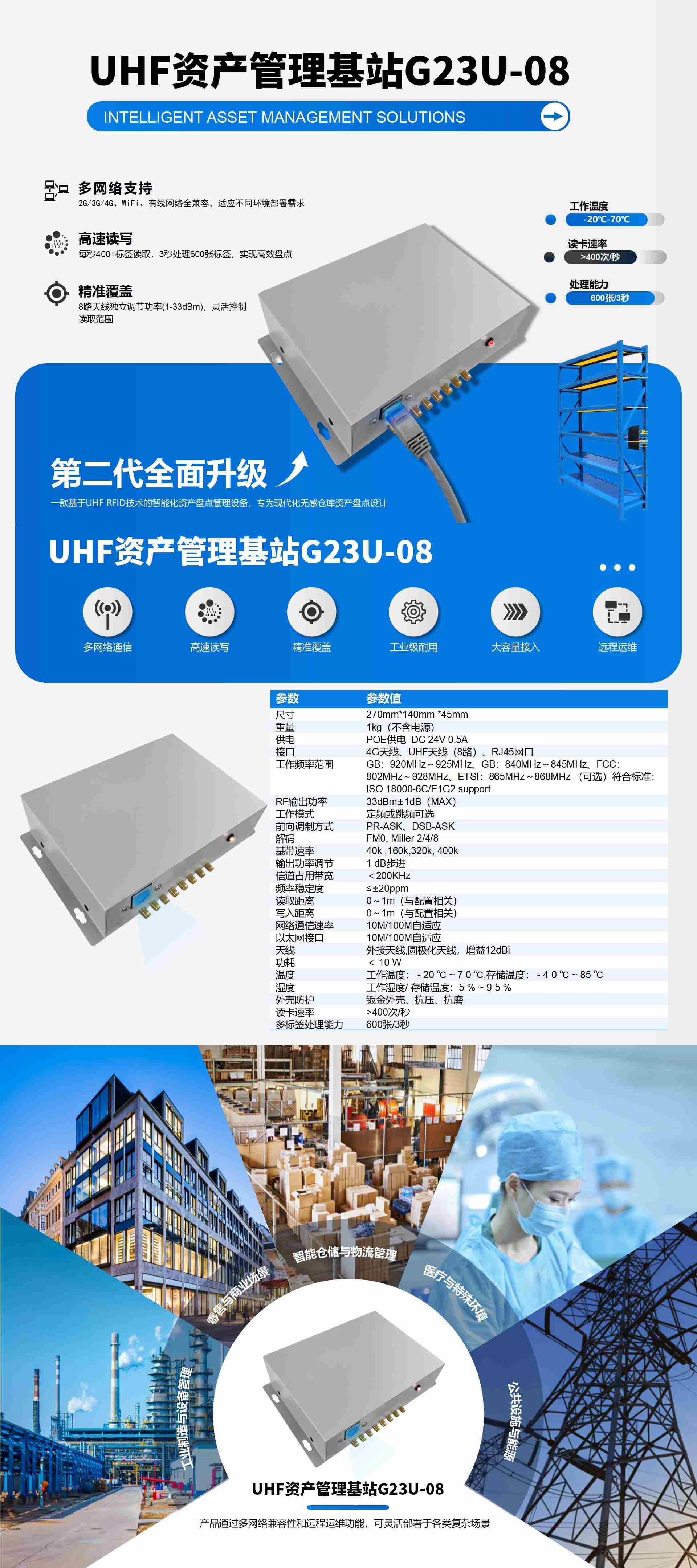該基站采用工業(yè)級設(shè)計(jì),采用鈑金外殼防護(hù),抗壓抗磨損。外接8路射頻天線,一臺基站可覆蓋多個(gè)貨架減少主機(jī)用量,設(shè)備每秒可讀取400個(gè)以上標(biāo)簽數(shù)據(jù),滿足大規(guī)模資產(chǎn)盤點(diǎn)的精準(zhǔn)管理需求。設(shè)備支持4G/有線網(wǎng)絡(luò)多種通信方式,數(shù)據(jù)可實(shí)時(shí)上傳至管理平臺,幫助企業(yè)實(shí)時(shí)了解資產(chǎn)狀態(tài),實(shí)現(xiàn)資產(chǎn)溯源、精確盤點(diǎn)和定位管理。