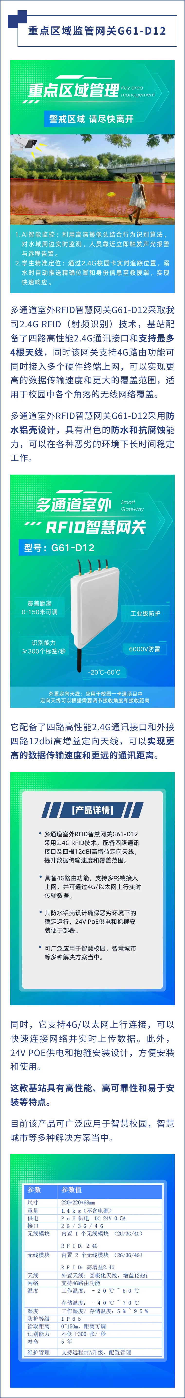 多通道室外RFID智慧網(wǎng)關(guān)G61-D12采取我司2.4G RFID(射頻識(shí)別)技術(shù),基站配備了四路高性能2.4G通訊接口和支持最多4根天線,同時(shí)該網(wǎng)關(guān)支持4G路由功能可同時(shí)接入多個(gè)硬件終端上網(wǎng)。可以實(shí)現(xiàn)更高的數(shù)據(jù)傳輸速度和更大的覆蓋范圍,適用于校園中各個(gè)角落的無(wú)線網(wǎng)絡(luò)覆蓋,多通道室外RFID智慧網(wǎng)關(guān)G61-D12采用防水鋁殼設(shè)計(jì),具有出色的防水和抗腐蝕能力,可以在各種惡劣的環(huán)境下長(zhǎng)時(shí)間穩(wěn)定工作。它配備了四路高性能2.4G通訊接口和外接四路12dbi高增益定向天線,可以實(shí)現(xiàn)更高的數(shù)據(jù)傳輸速度和更遠(yuǎn)的通訊距離。同時(shí),它支持4G/以太網(wǎng)上行連接,可以快速連接網(wǎng)絡(luò)并實(shí)時(shí)上傳數(shù)據(jù)。此外,24V POE供電和抱箍安裝設(shè)計(jì),方便安裝和使用。這款基站具有高性能、高可靠性和易于安裝等特點(diǎn)。