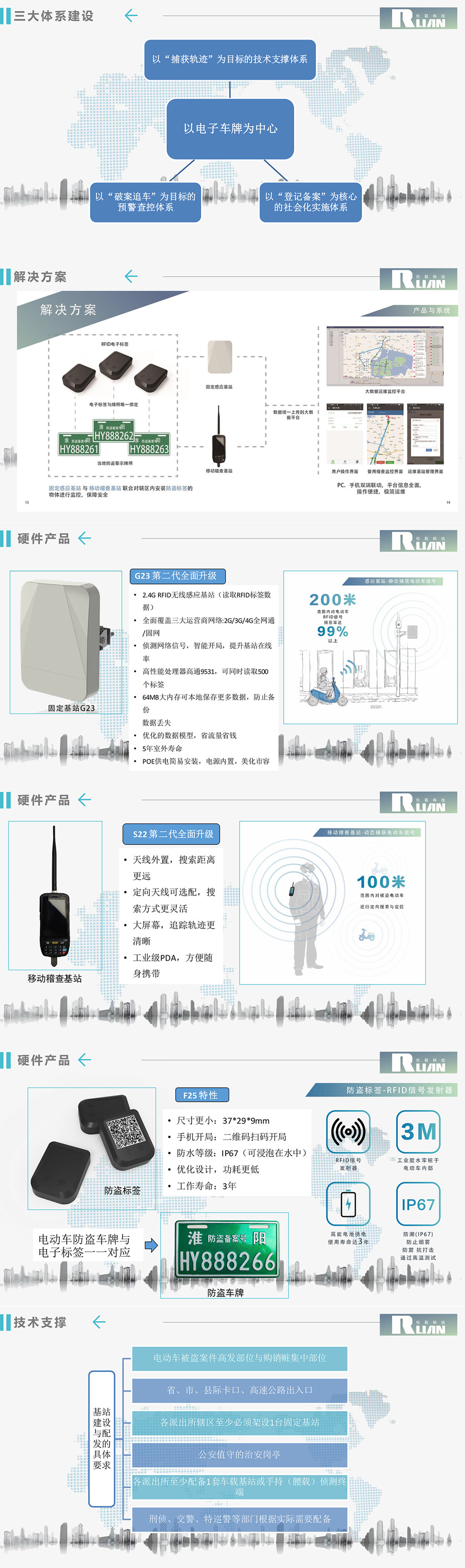 任聯(lián)電動(dòng)車防盜系統(tǒng)解決方案是杭州任聯(lián)自主研發(fā)的成熟解決方案。其基本原理為:基于物聯(lián)網(wǎng)超低功耗RFID有源技術(shù)和大數(shù)據(jù)軌跡刻畫技術(shù),監(jiān)控中心、固定基站、車載基站、手持搜索機(jī)無(wú)縫協(xié)同,捕獲被盜車輛信號(hào),高效破案。